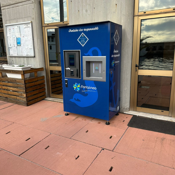 Station de remplissage d'eau bleue avec écran numérique et zone de distribution. Elle arbore des logos et des textes en français, promouvant l'éco-responsabilité. La station est située en extérieur, derrière des portes vitrées, avec vue sur l'eau et la marina en arrière-plan.
